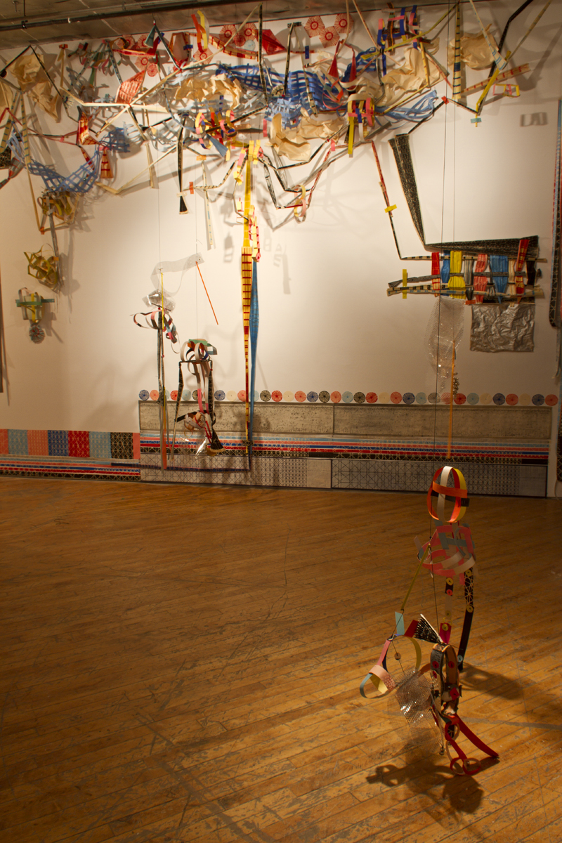 In the northeast corner a puppet baby rests in a hanging basket. Two boxy figures with accordion-fold bodies and limbs hold each other on the other side of the room, and closer inspection reveals that a select cast of humanoid and creatural paper marionettes made of similar paper elements inhabits the entire installation. Hague’s wall-mounted imagery conveys a tension between the animate and the inanimate; this opposition is further amplified in these puppets. They read as viable, they have appendages that we interpret as heads or arms or legs, and Hague has equipped them with leads and tethers so that we can encourage their movement. They inhabit the space and narrative even when we are not there, and make evident the fact that what we are seeing is a story with particular characters. Sharing the space with them, they are dependent on us for life. However, try as we might to, we cannot coax much more than the smallest hint of activity into them. By their very design they are awkward and imperfect perambulators. They are the life forms in this paper universe, and we are drawn to them, but they are inevitably limited as beings.