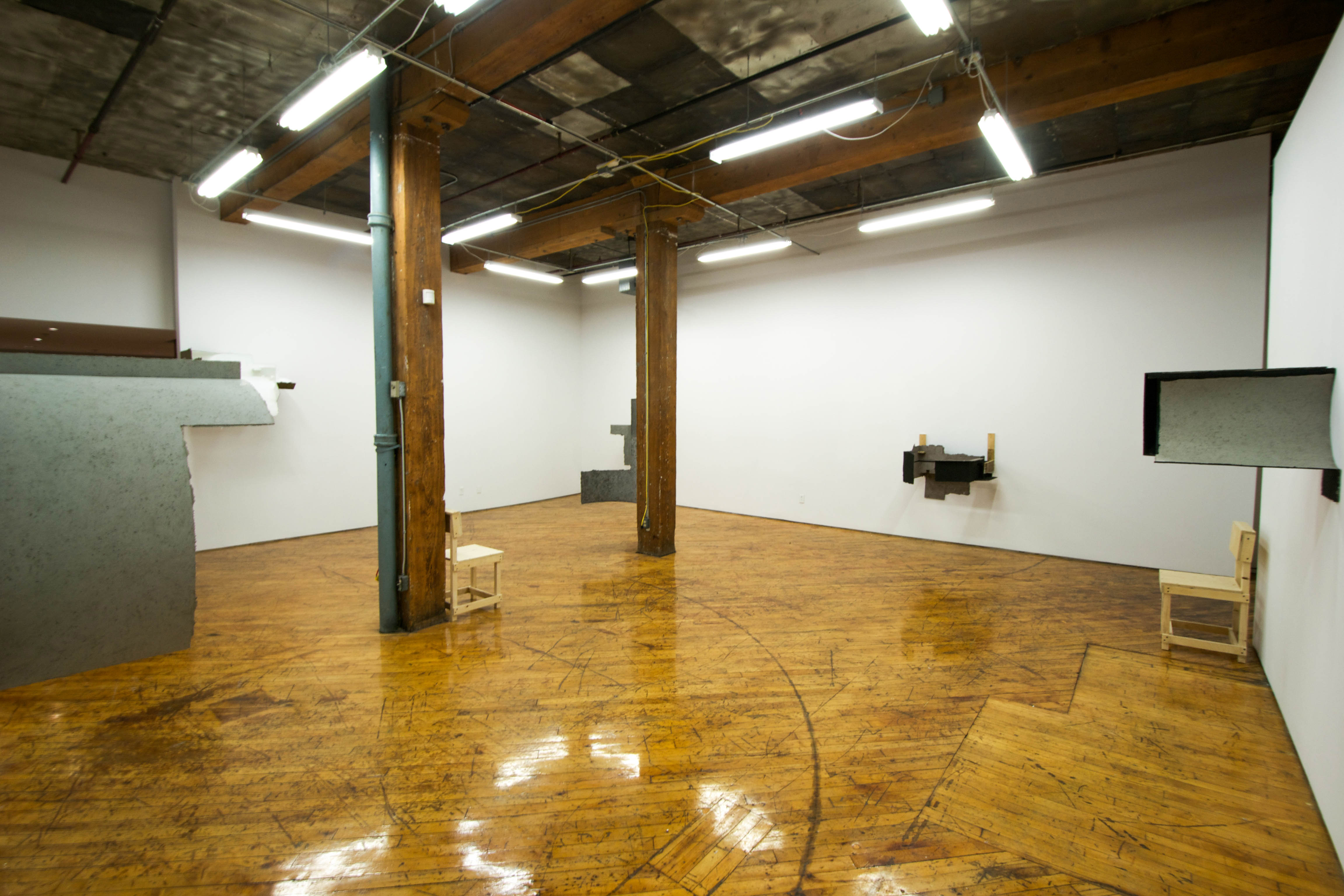 For her exhibition Kaloune, Jen Aitken presents a new series of wall-mounted sculptures. Over the last several years, Aitken has developed a restricted geometric vocabulary that draws from her everyday built environment but resists any definitive references. Her sculptures are independent idiosyncratic objects, yet they accumulate meaning together through their shared visual lexicon. In a continuous search for new possibilities within her limited set of shapes, Aitken now shifts her focus from solid volume to negative space. She has imagined cutting up and unfolding the forms of her recent cast concrete work to create a number of open planar structures.