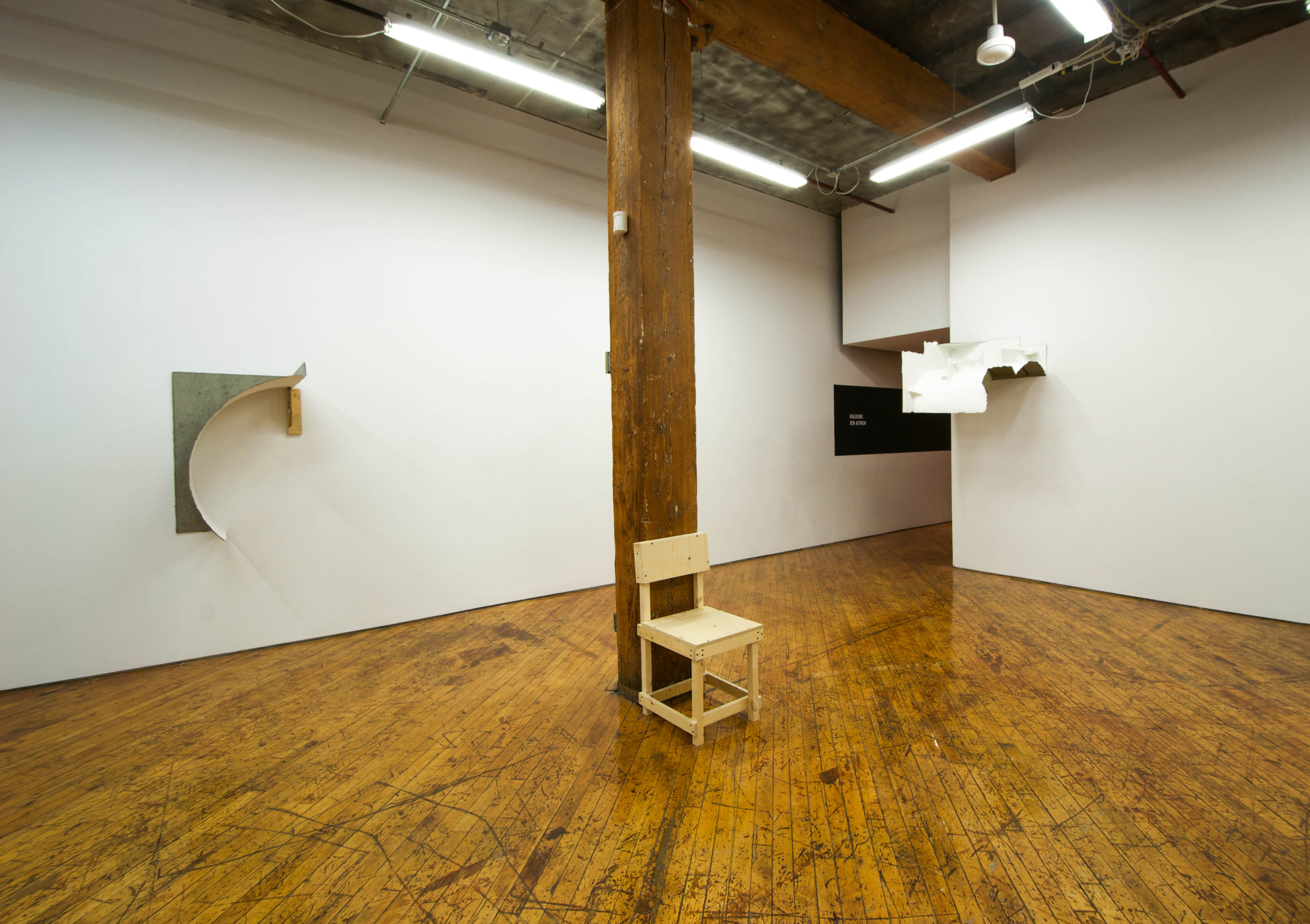Kaloune shows Aitkens attempt to unfasten the surface of concrete from its inherent mass. Adding paper pulp and other ingredients to her cement mixture, she has pressed thin layers of material into molds made of wood, plastic, foam, and cardboard. The resulting forms are not standard positive casts, but muted translations of her ad hoc molds. They are partial fragmented containers made inside and around other containersnegative forms for which there are no corresponding positives. Kaloune evokes a sense of sustained ambiguity, and invites our focus to drift continuously between space and material, two and three dimensions, object and installation, and between stillness and motion.
